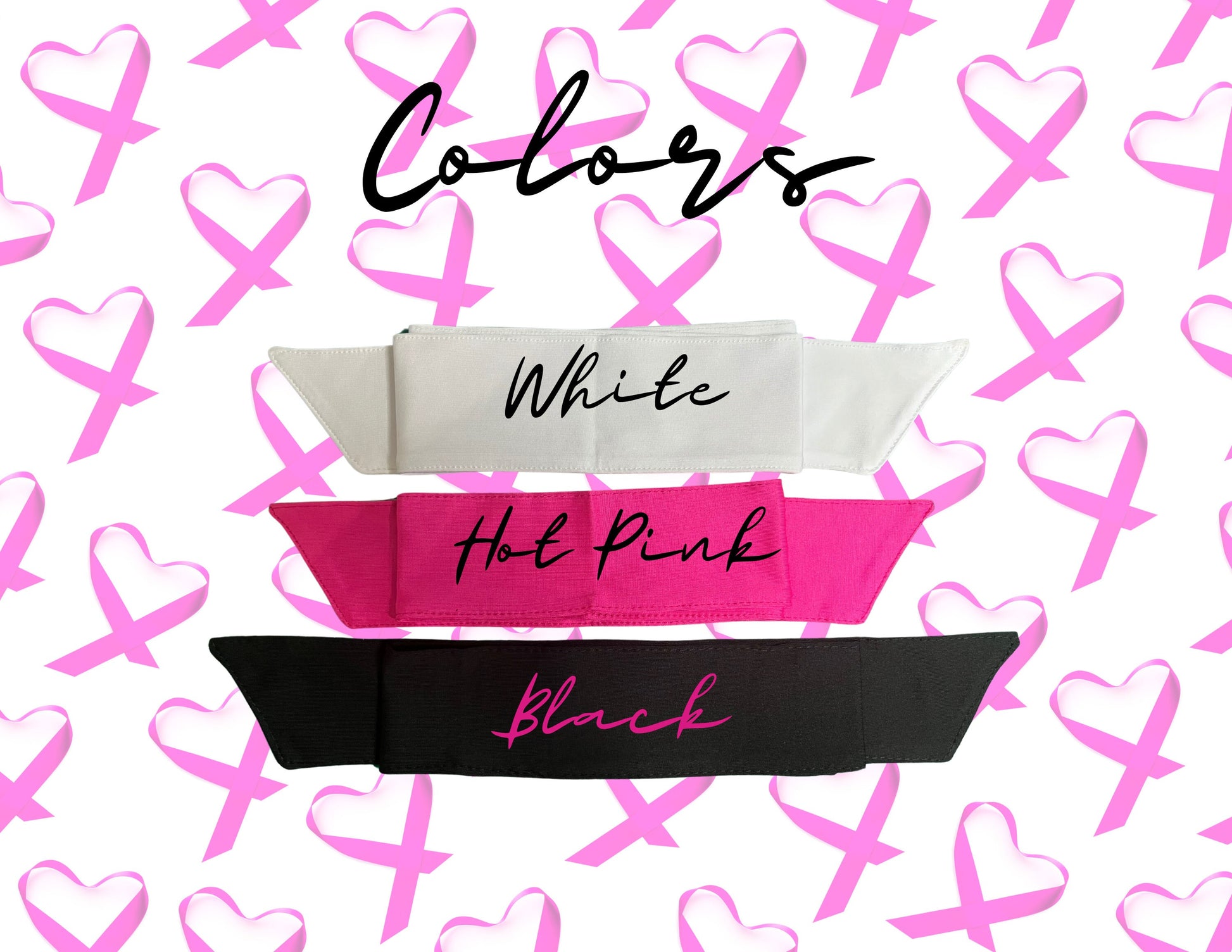 Personalized Tieback headbands for Breast Cancer Awareness Pink Out. Customize this sport headband with your team's name on the forehead or your player's name or nickname in vibrant and high-quality hot pink vinyl for black bands, white or black vinyl for pink bands and sublimation on white bands .