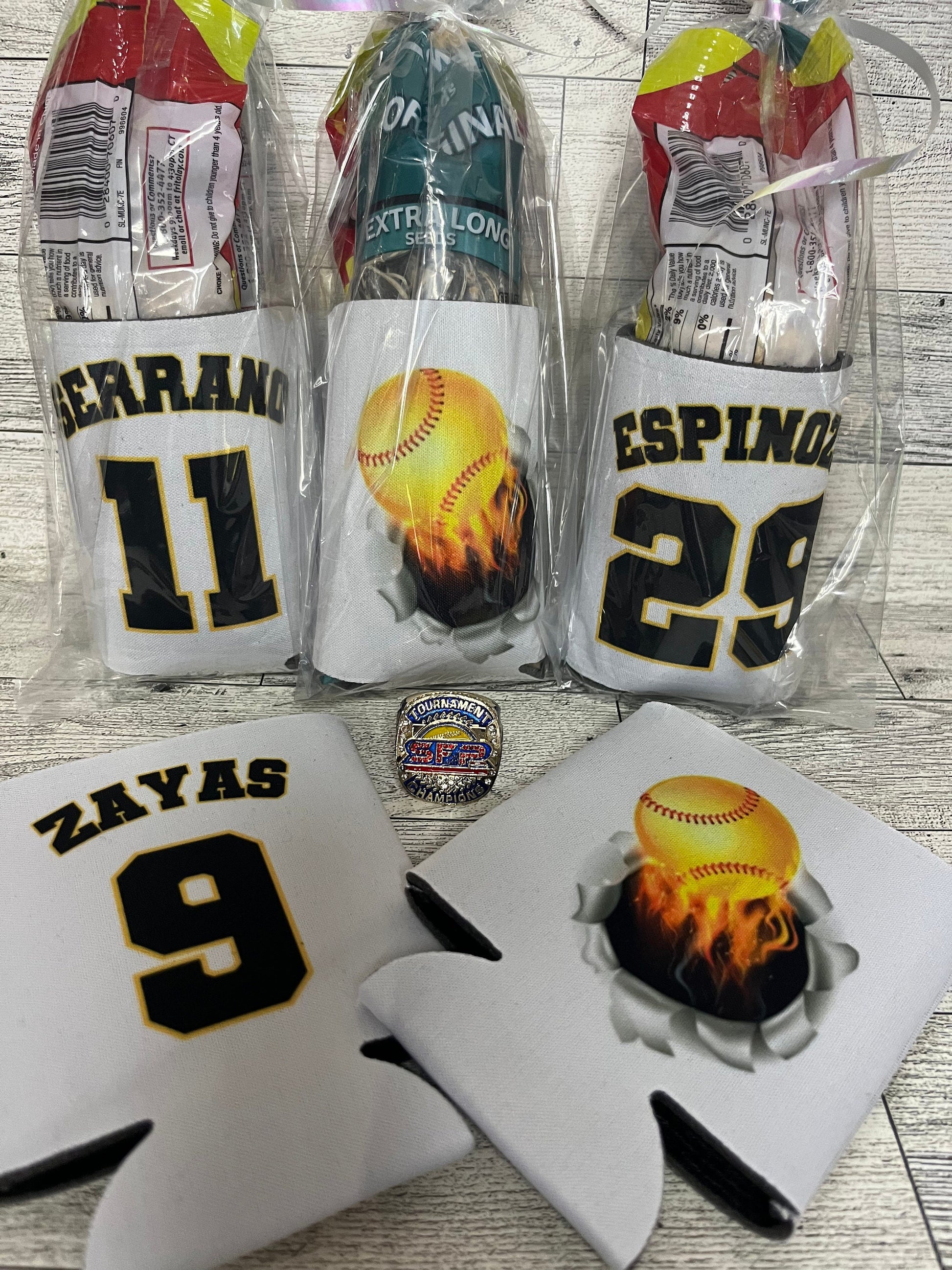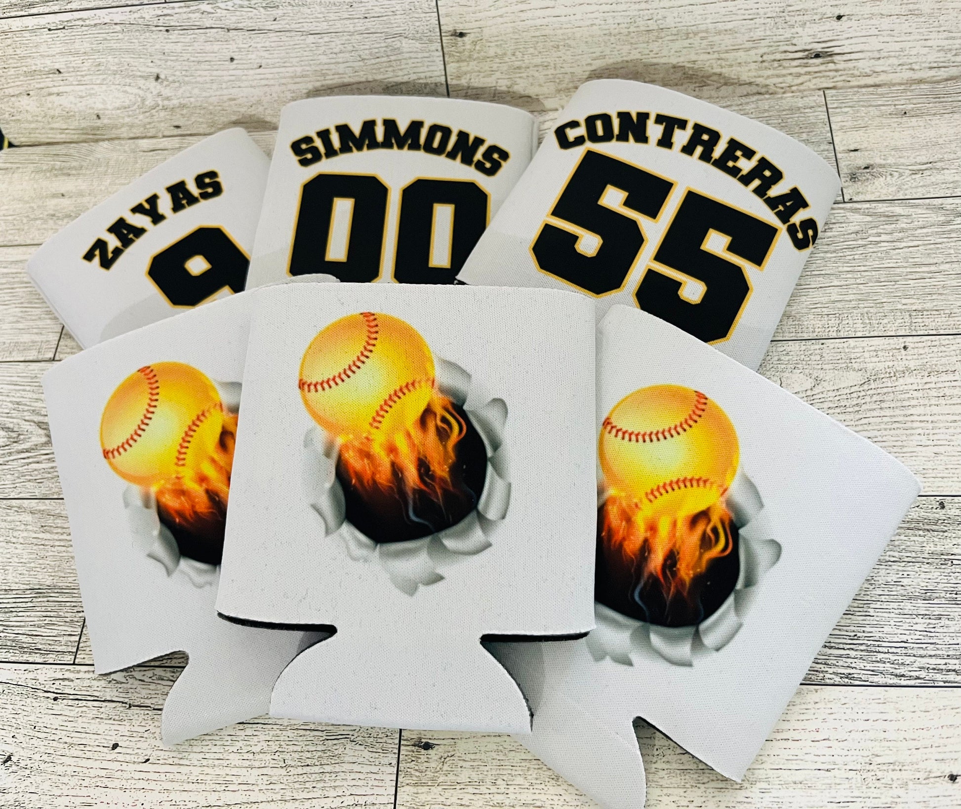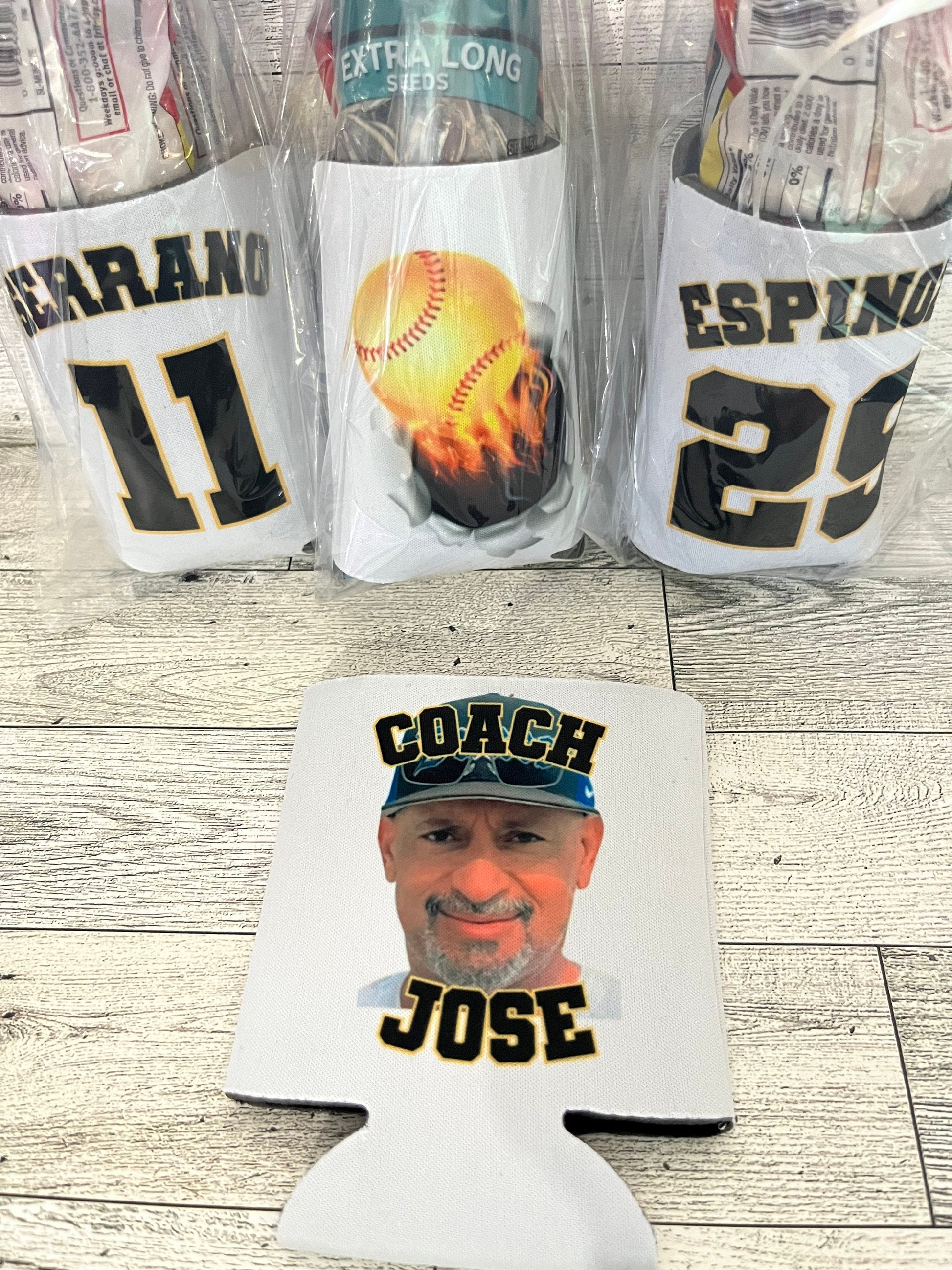 Double sided personalized can sleeves. Fully customizable on a white medium. Just send us your logo/image and we'll do the rest. Perfect for Father's Day, birthdays, bachelor parties, anniversary, cookouts, team parties, end of season gifts, gift baskets, etc. Sublimated image for maximum durability and bright colors.