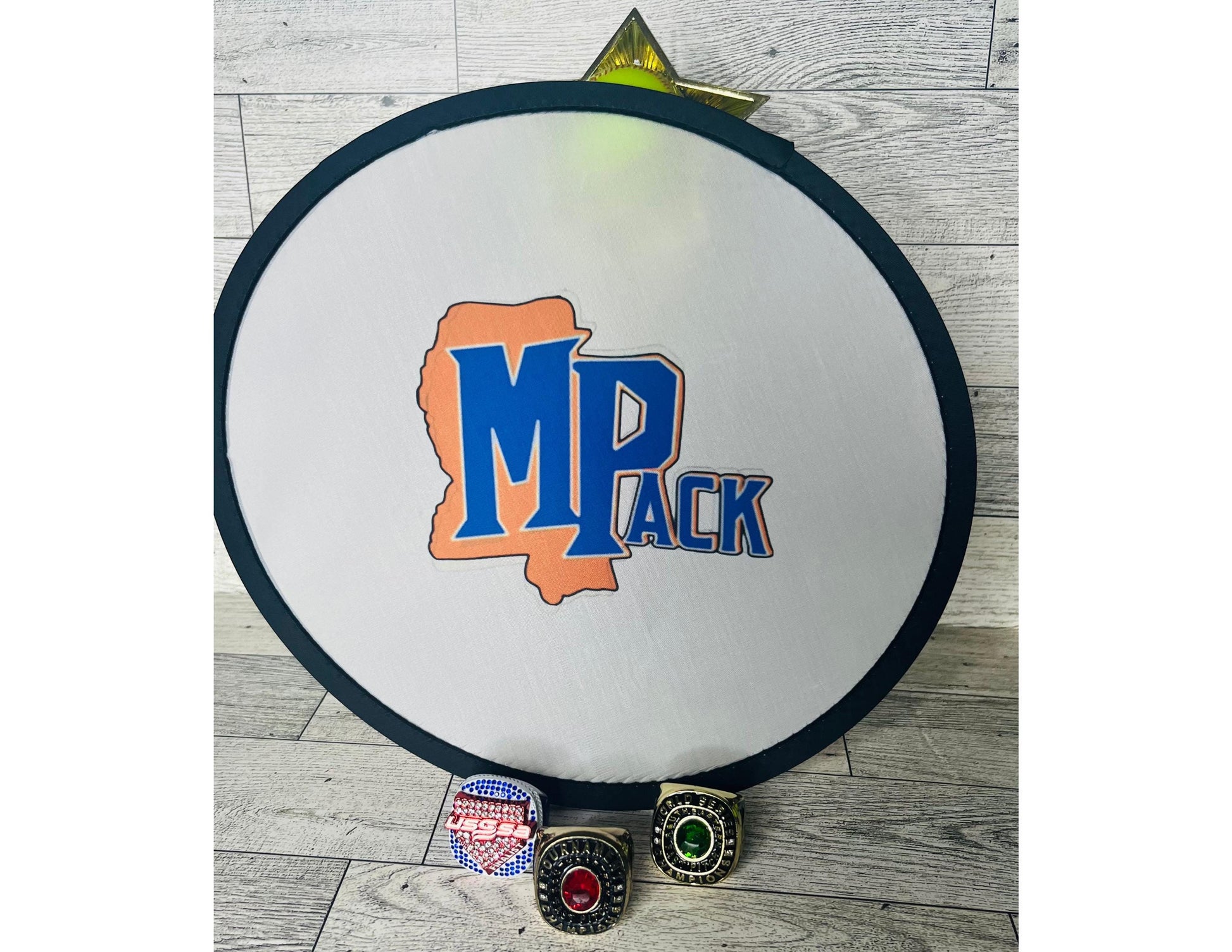 Personalized folding disc fan. Customize with your favorite photos, team logo, names, or special messages. Lightweight. Folding fan is about 9.8 inches in diameter when opened and about 3.5 inch when folded (carrying bag size is 3.8x3.6 inches).