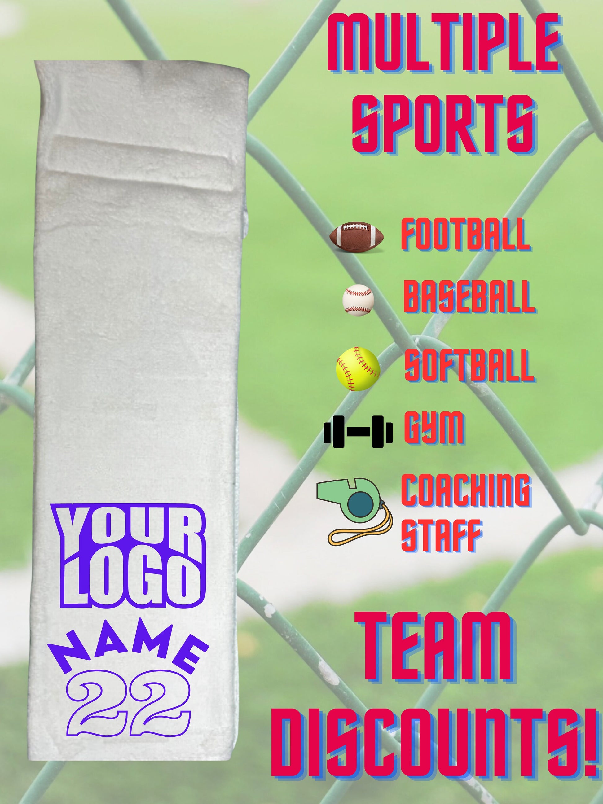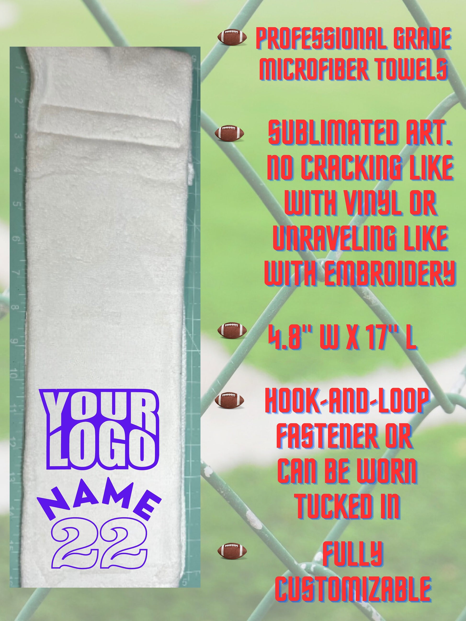 Personalized football Quarterback towels. Showcase your team's logo, colors, name/number or any design of your choice. Sublimated white microfiber towel. Thick but soft to the touch. Please note, this is not a cooling towel. Our towels are meant to be used at the field! It will never fade, crack or peel like vinyl or unravel like embroidery, making it a durable option for regular use. Easy hook-and-loop fastener to attach to any belt, or you can choose to wear it tucked in. Dimensions: 4.8" x 17 inch folded. Perfect for other sports besides football, such as such as baseball and softball.