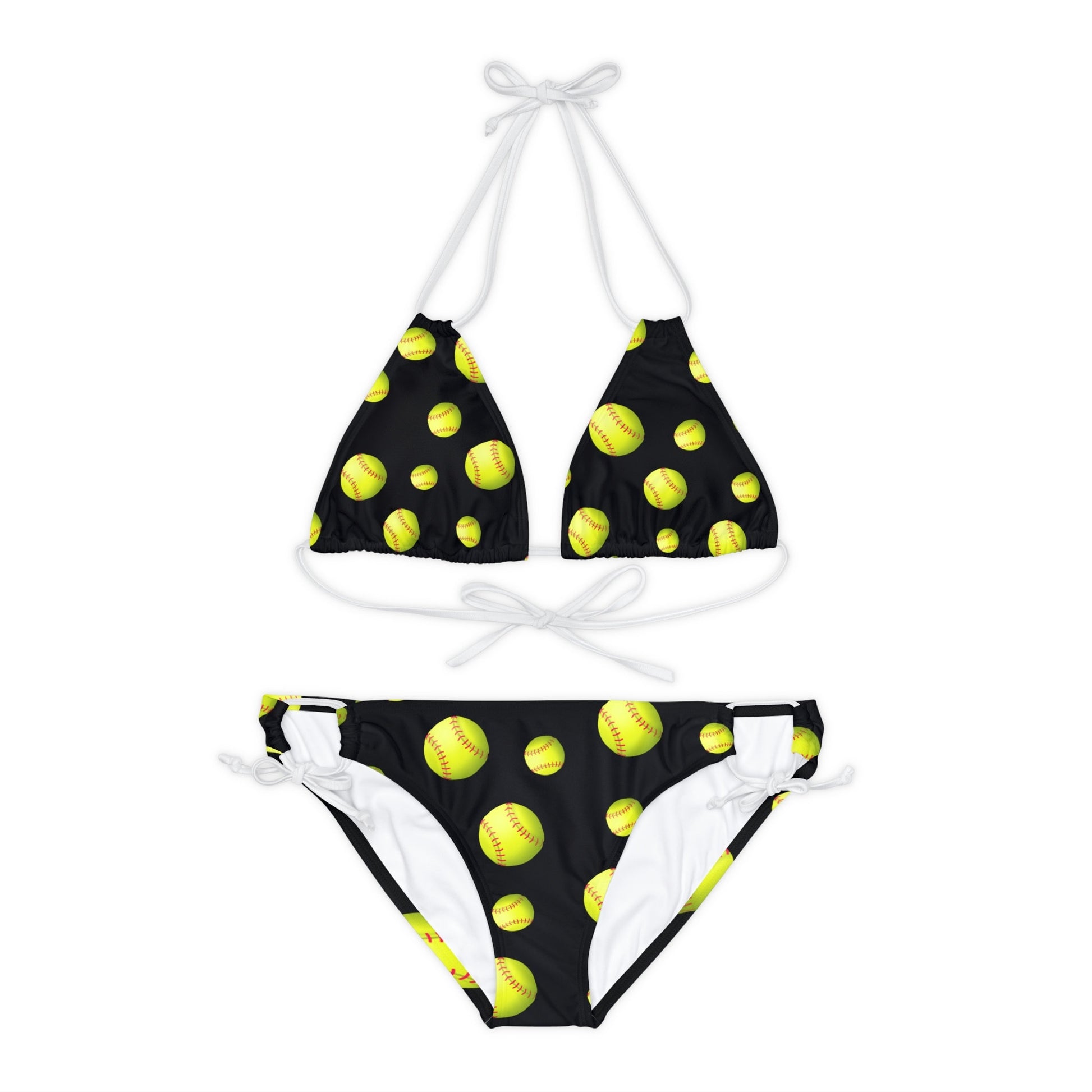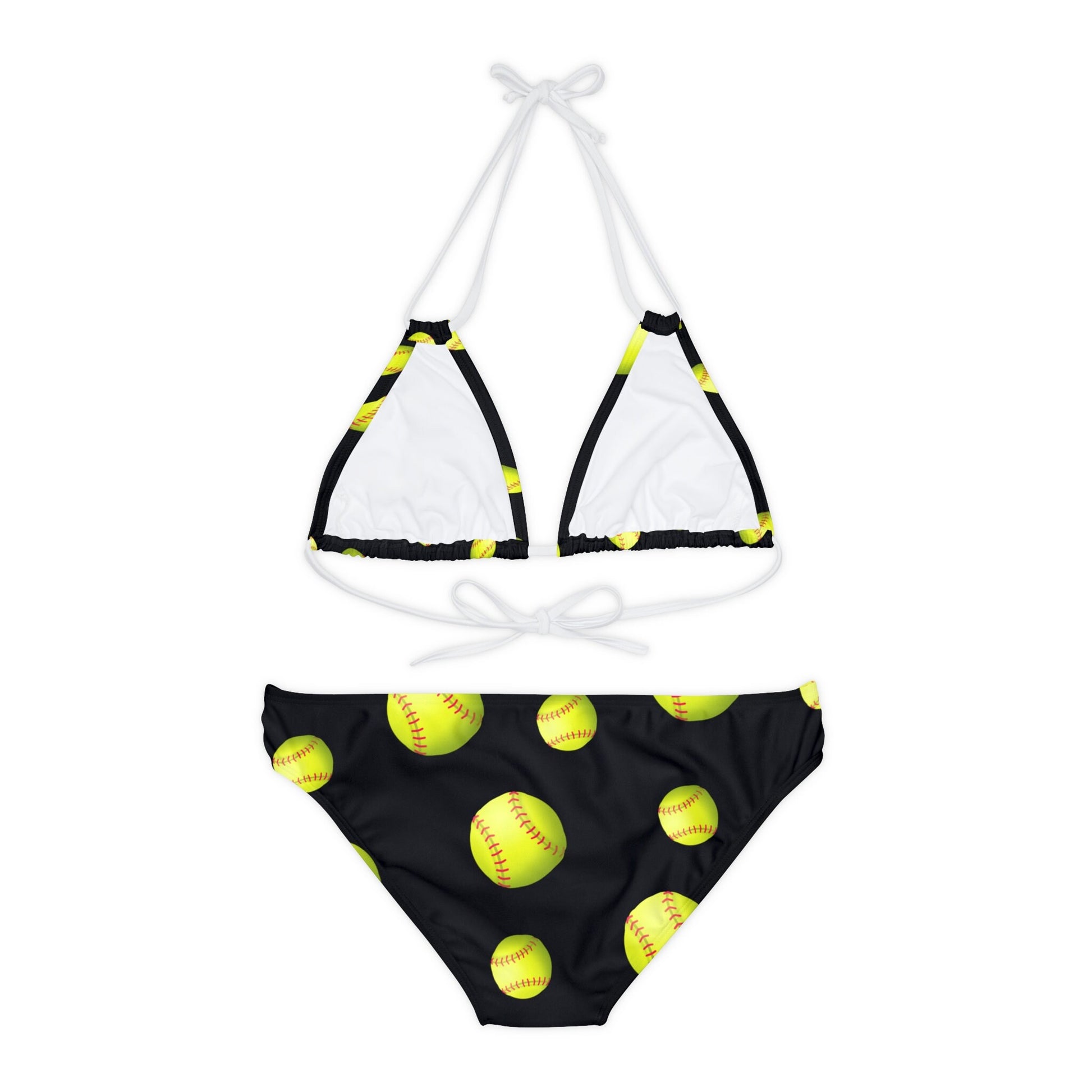 Softball two-piece swimsuit. Fun and cute for those hot summer days after tournaments. Made with 4-way stretch Tricot (82% Microfiber, 18% Spandex). Adjustable elastic straps and removable cups. Please see size chart (in pictures).